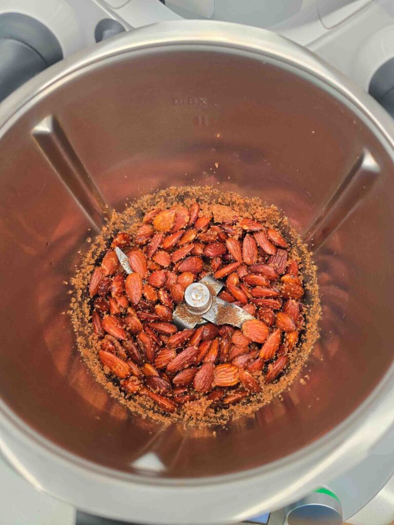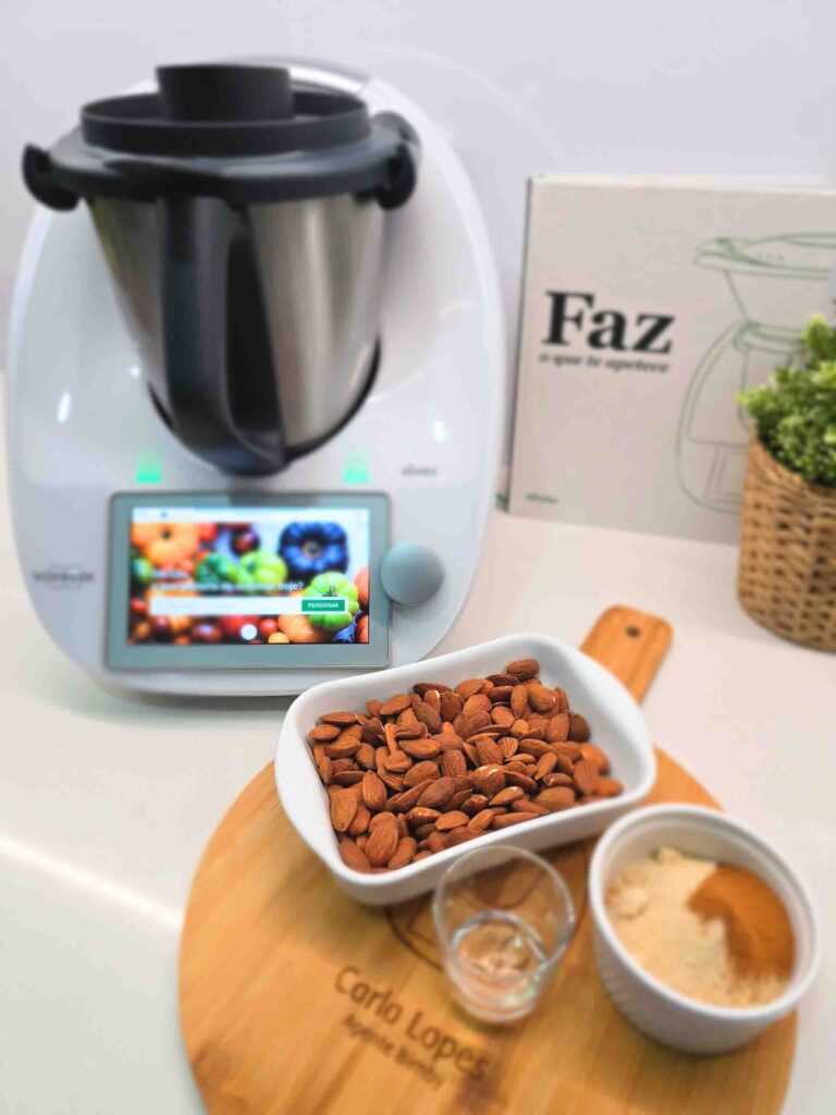 - Coloca no copo as amêndoas, a manteiga, o açúcar e a canela e programa 5 min/120º/colher inversa.