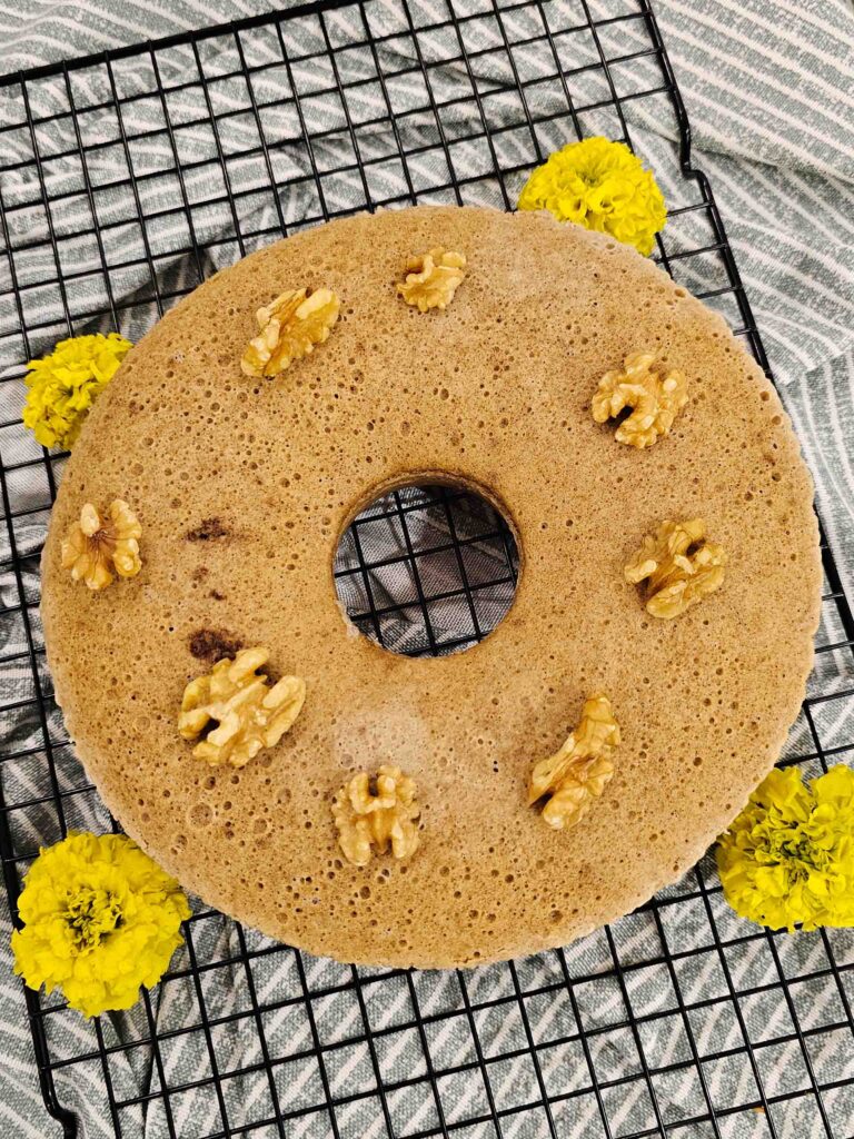 - Deite o preparado numa forma untada com manteiga e polvilhada com farinha de amêndoa. Decore o bolo com nozes picadas. Tape a forma com papel de alumínio e coloque a forma na varoma.