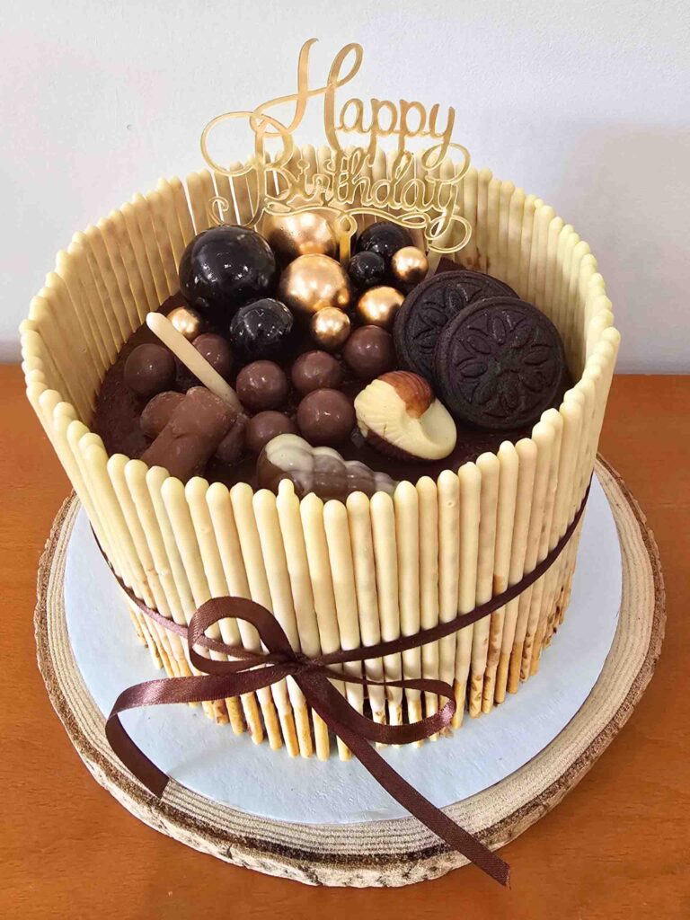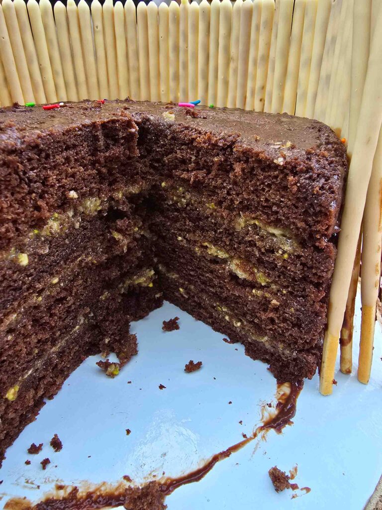 Para a cobertura, fiz um ganache de chocolate e depois decorei com palitos e mais chocolates.
