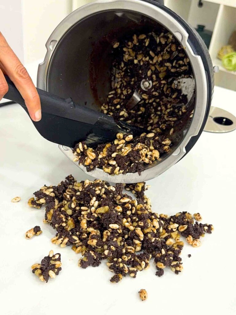 A bolacha foi substituída por nozes e arroz tufado e a manteiga e as gemas, por manteiga de amendoim.